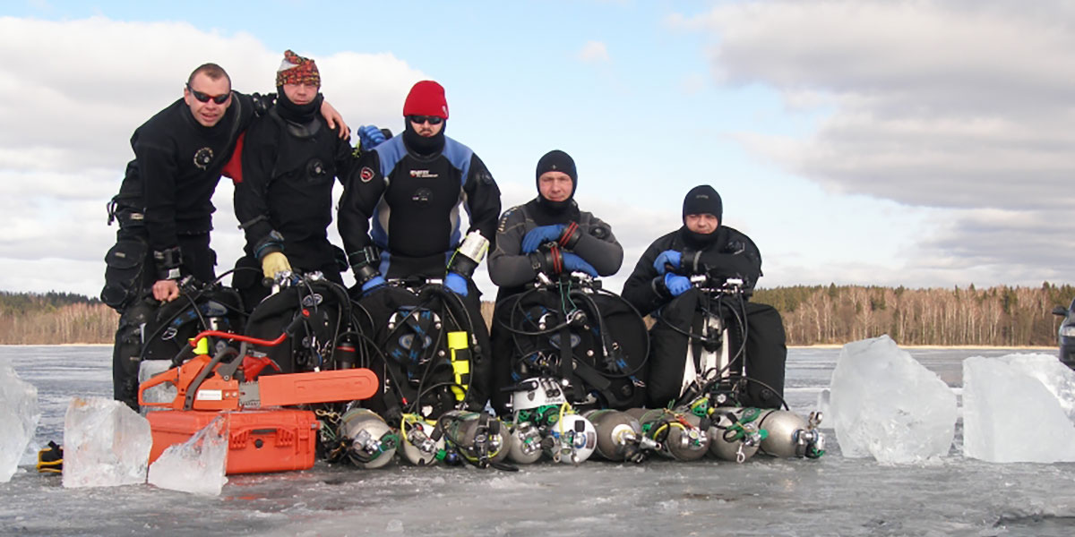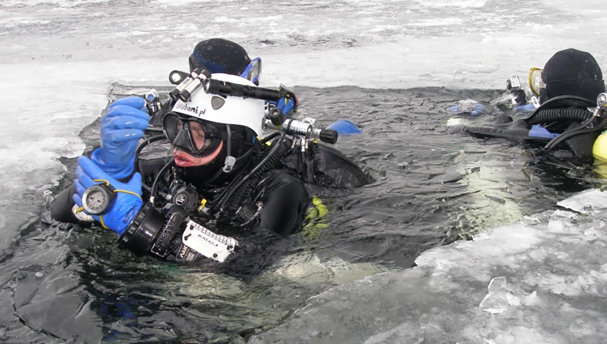 Udaliśmy się zatem inną drogą w pobliże brzegu jeziora i tam zgodnie z kanonami dobrej praktyki nurkowej przygotowaliśmy przerębel. Sonda wędkarska w tym miejscu wskazała 9,5 metra.